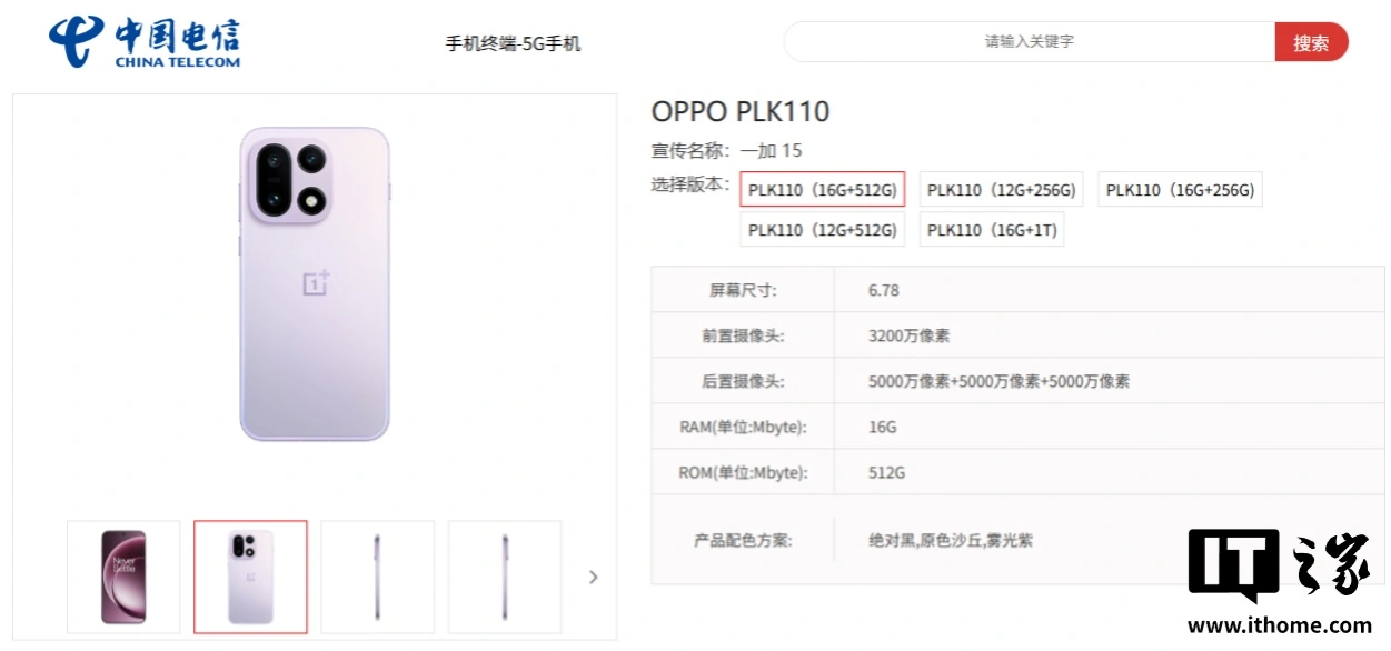 IT之家 10 月 26 日消息,型号为“OPPO PLK110”的一加 15 手机已现身中国电信终端产品库。该机提供 12GB+256GB、16GB+256GB、12GB+512GB、16GB+512GB、16GB+1TB 五种存储规格,拥有绝对黑、原色沙丘、雾光紫三种配色,产品零售价格尚未公布。